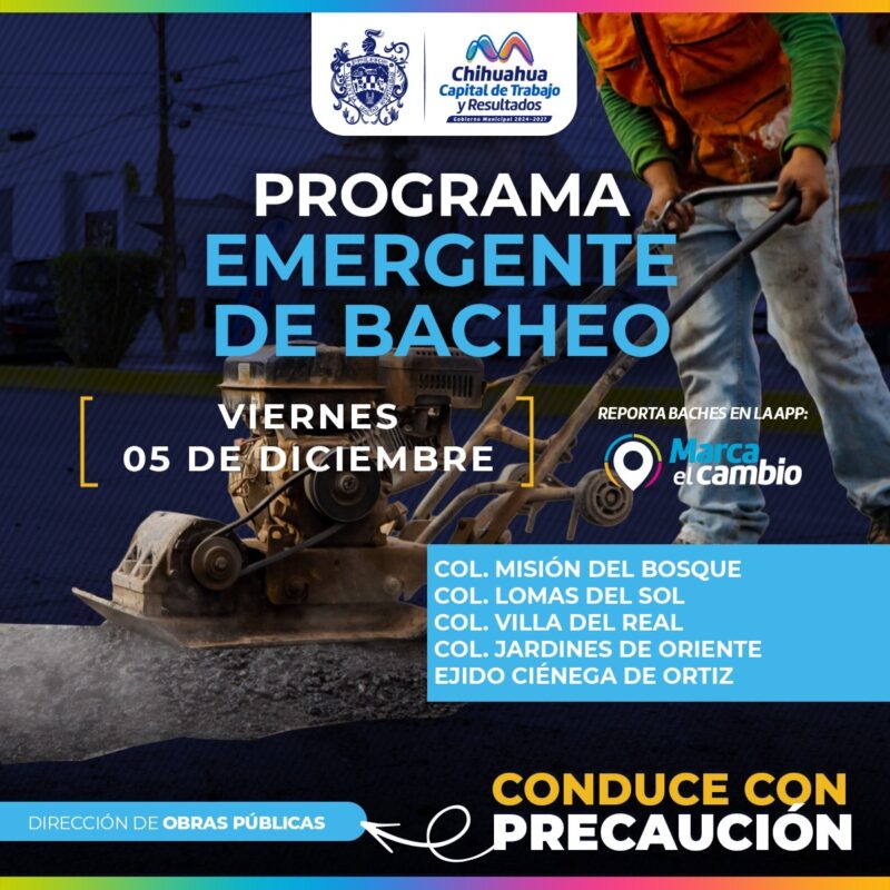 H. Ciudad de Chihuahua, Chih., a 5 de diciembre del 2025.- El Gobierno Municipal, a través de la Dirección de Obras Públicas, realizará trabajos de bacheo este viernes 5 de diciembre, mediante el programa emergente en calles de las colonias: Misión del Bosque, Lomas del Sol, Villa del Real, y Jardines de Oriente, así como en la comunidad de Ciénega de Ortiz.