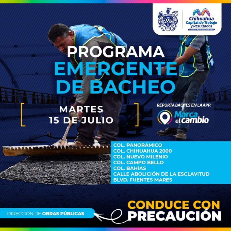 H. Ciudad de Chihuahua, Chih. A 15 de julio del 2025.- El Gobierno Municipal a través de la Dirección de Obras Públicas, realizará trabajos de bacheo mediante el programa emergente en las colonias Panorámico, Chihuahua 2000, Nuevo Milenio, Campo Bello y Bahías, así como en la calle Abolición de la Esclavitud y en el boulevard Fuentes Mares.