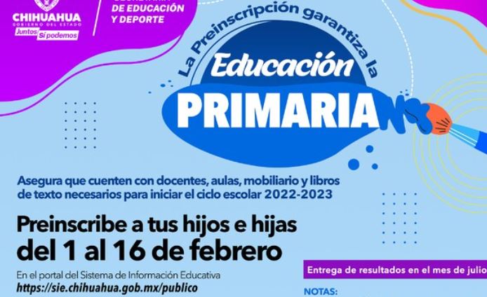 La SEyD precisa que madres, padres o tutores tendrán hasta el 16 de febrero para hacer el registro del estudiante. Los resultados de la asignación de espacios se publicarán durante el mes de julio en el portal del SIE y en la página oficial de la dependencia: http://educacion.chihuahua.gob.mx/.
