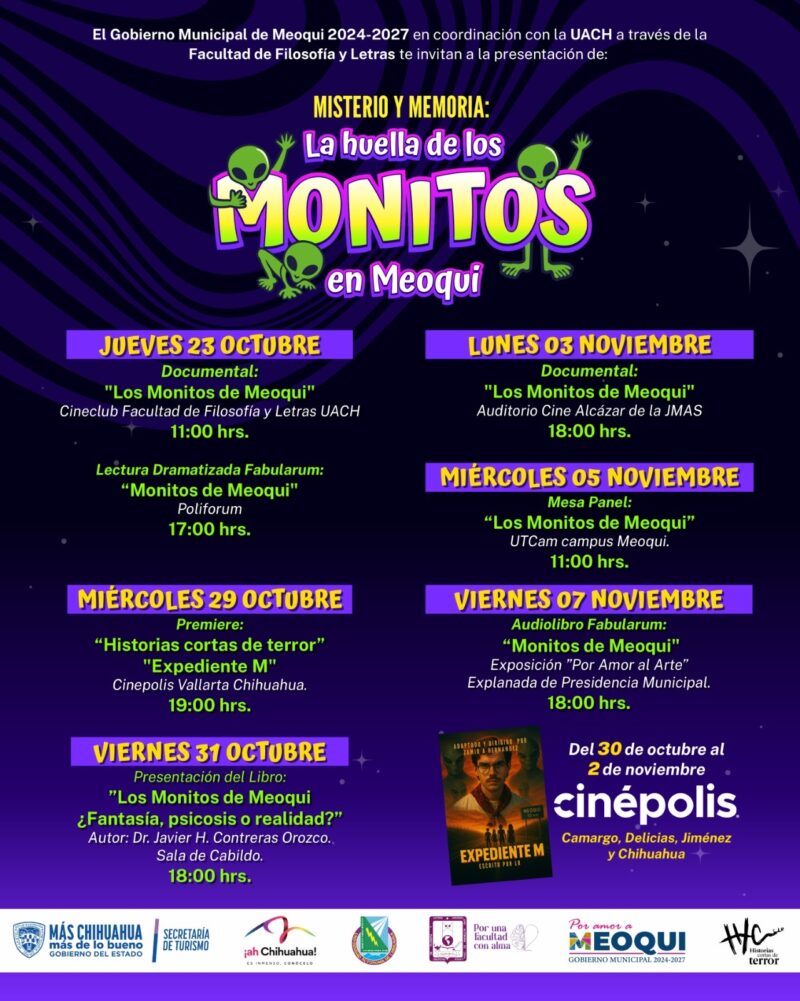 Como parte del 38 aniversario de la Leyenda de los Monitos de Meoqui y gracias a las alianzas entre la Facultad de Filosofía y Letras de la UACH, el equipo de Historias Cortas de Terror, la Secretaria de Turismo de Gobierno del Estado, el Fideicomiso ¡Ah Chihuahua! y Gobierno Municipal, prepararon el Programa “Misterio y Memoria: La Huella de los Monitos en Meoqui” que incluye la presentación de un libro, un documental, audio libro, una mesa panel y cortometraje.