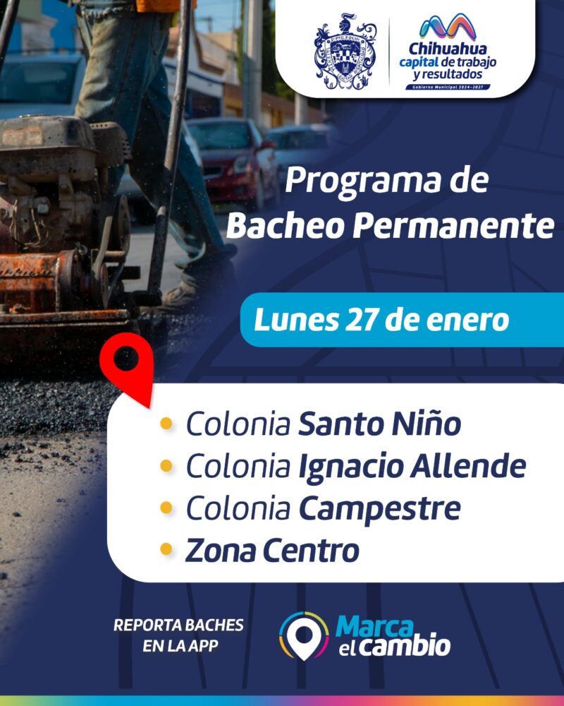 Chihuahua, Chih. A 27 de enero de 2025.- El Gobierno Municipal, a través de la Dirección de Obras Públicas, dará atención con el programa permanente de bacheo en calles de las colonias Santo Niño, Ignacio Allende, fraccionamiento Campestre y Zona Centro.
