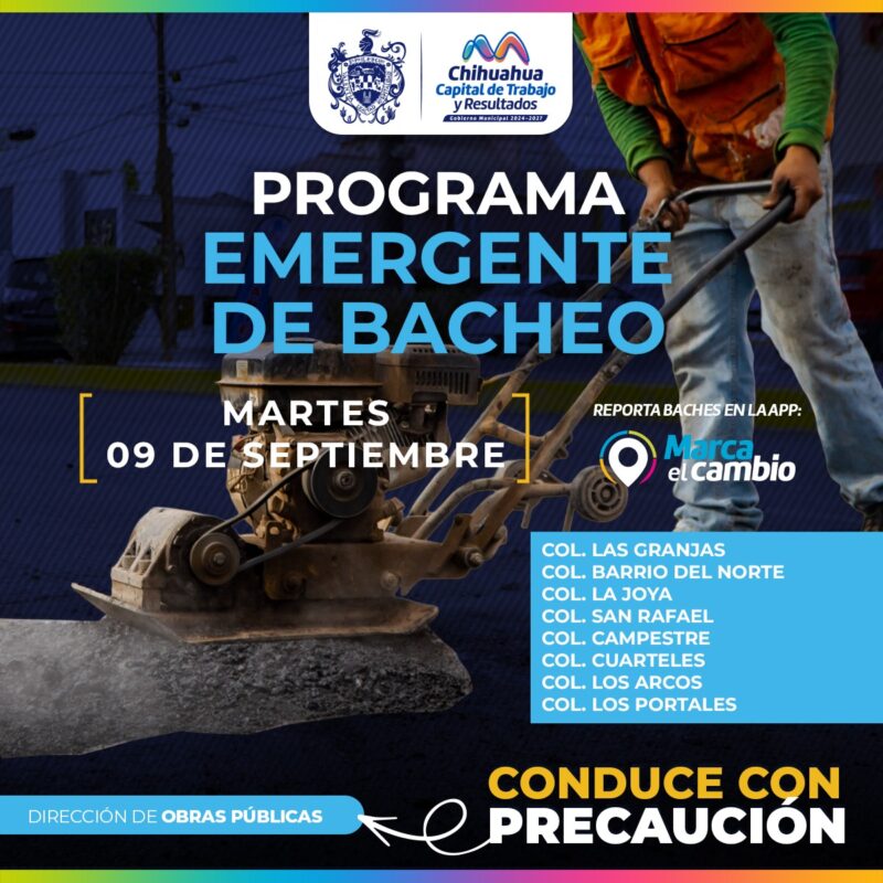H. Ciudad de Chihuahua, Chih., a 09 de septiembre del 2025.- El Gobierno Municipal, a través de la Dirección de Obras Públicas, atenderá baches este 9 de septiembre, mediante el programa emergente, en las colonias Las Granjas, Barrio del Norte, La Joya, San Rafael, Campestre, Cuarteles, Los Arcos y Los Portales.
