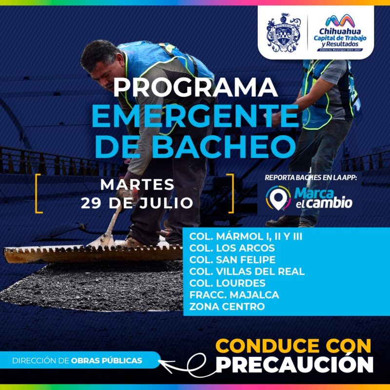H. Ciudad de Chihuahua, Chih., a 29 de julio del 2025.- El Gobierno Municipal, a través de la Dirección de Obras Públicas, bacheará este 29 de julio mediante el programa emergente en las colonias Mármol I, II y III, Los Arcos, San Felipe, Villas del Real, Fraccionamiento Majalca, Lourdes y en la Zona Centro.