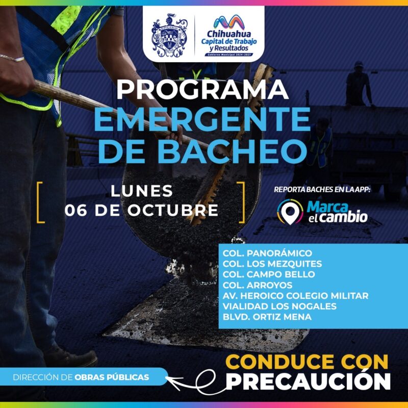 H. Ciudad de Chihuahua, Chih., A 6 de octubre del 2025.- El Gobierno Municipal, a través de la Dirección de Obras Públicas, bacheará este 6 de octubre, mediante el programa emergente, en calles de las colonias Panorámico, Los Mezquites, Campo Bello y Arroyos, así como en la avenida Heroico Colegio Militar, Vialidad Los Nogales y el boulevard Ortiz Mena.