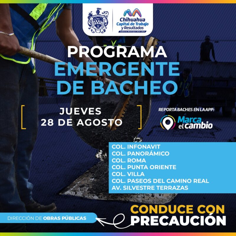 H. Ciudad de Chihuahua, Chih., a 28 de agosto del 2025.- El Gobierno Municipal, a través de la Dirección de Obras Públicas, trabajará con bacheo hoy 28 de agosto, mediante el programa emergente, en las colonias Infonavit, Panorámico, Roma, Punta Oriente, Villa, Paseos del Camino Real y en la avenida Silvestre Terrazas.