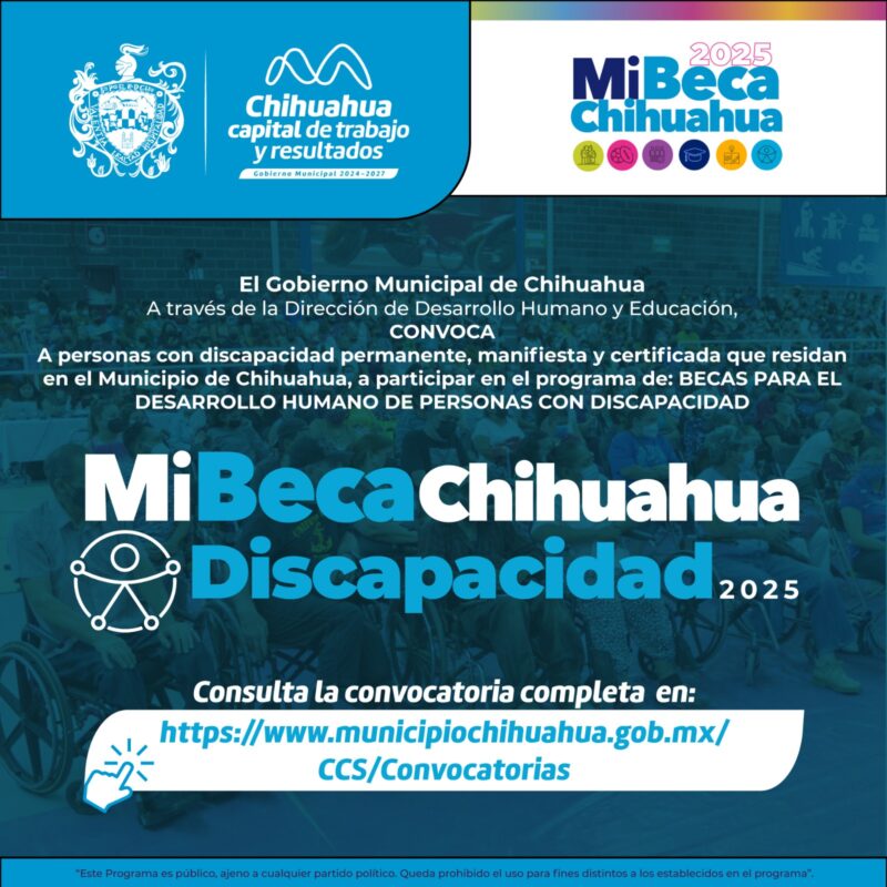 Chihuahua, Chih., a 16 de febrero de 2025.- El Gobierno Municipal, a través de la Dirección de Desarrollo Humano y Educación, da a conocer la convocatoria Mi Beca Chihuahua Discapacidad edición 2025, para personas con discapacidad permanente, manifiesta y certificada que residan en el municipio de Chihuahua.