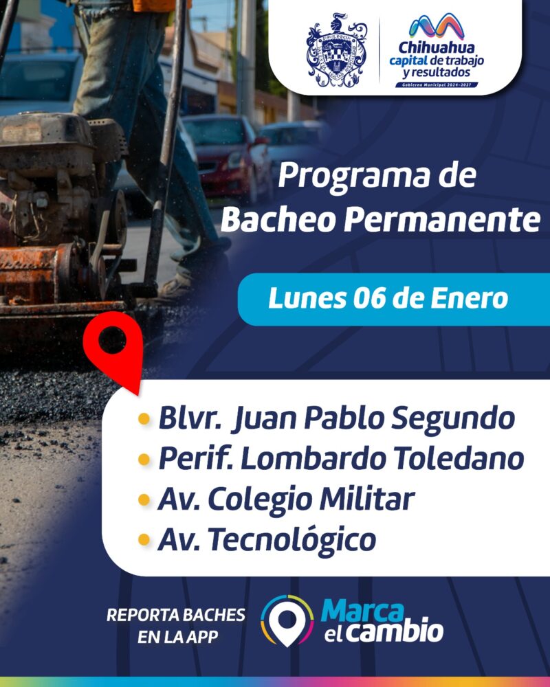 Chihuahua, Chih., a 6 de enero de 2025.- El Gobierno Municipal que encabeza el alcalde Marco Bonilla, trabajará con bacheo este 6 de enero en boulevard Juan Pablo Segundo, periférico Lombardo Toledano y en las avenidas Heroico Colegio Militar y Tecnológico.