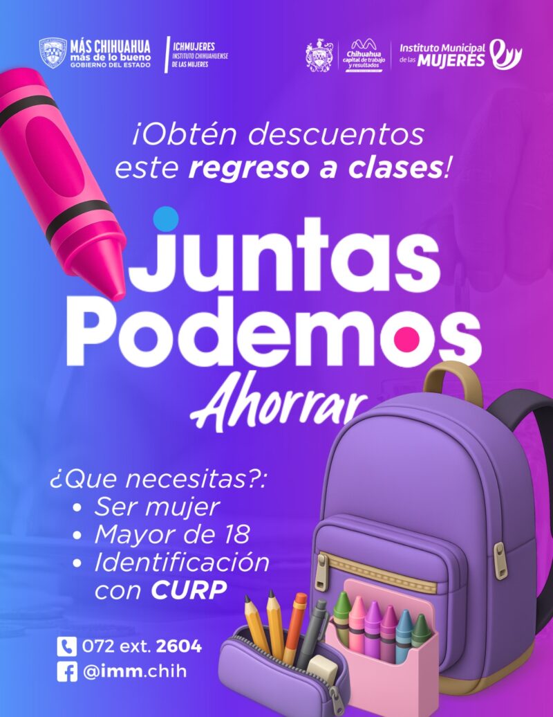 H. Ciudad de Chihuahua, Chih., a 12 de agosto de 2025.– El Gobierno Municipal de Chihuahua, a través del Instituto Municipal de las Mujeres (IMM), invita a todas las mujeres mayores de 18 años a tramitar la tarjeta “Juntas Podemos Ahorrar”, con la que podrán obtener atractivos descuentos en la compra de útiles escolares, artículos de oficina y productos para el regreso a clases.