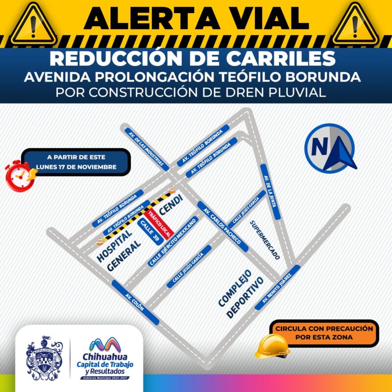 Se exhorta a la ciudadanía a circular con precaución a partir de este lunes 17 de noviembre ya que iniciarán labores desde las 9:00 am y se verá afectado el carril lateral de la avenida Prolongación Teófilo Borunda a la altura del Hospital General de Chihuahua «Dr. Salvador Zubirán Anchondo» hacia la avenida Carlos Pacheco.