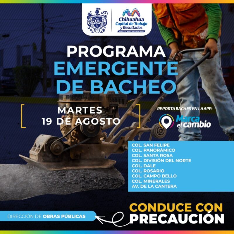 H. Ciudad de Chihuahua, Chih., a 19 de agosto del 2025.- El Gobierno Municipal, a través de la Dirección de Obras Públicas, trabajará este 19 de agosto con bacheo mediante el programa emergente en calles de las colonias: San Felipe, Panorámico, Santa Rosa, División del Norte, Dale, Rosario, Campo Bello, Minerales y en la avenida de la Cantera.