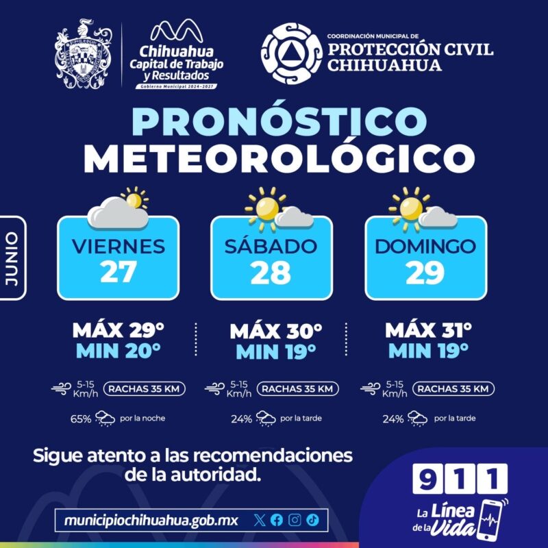 H. Ciudad de Chihuahua, Chih., a 27 de junio de 2025.- La Coordinación Municipal de Protección Civil informa que, para este fin de semana del 27 al 29 de junio, continuarán posibles lluvias en la capital, por lo que exhortan a seguir recomendaciones para cuidar la salud de las familias.