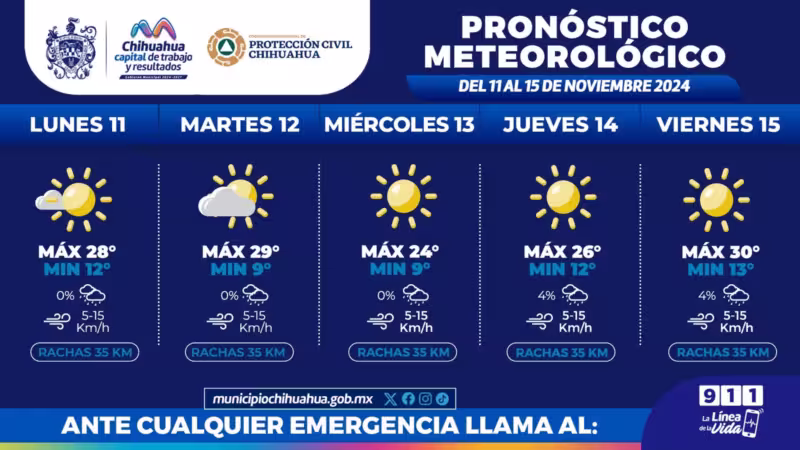 Chihuahua, Chih. A 11 de noviembre del 2024.- La Coordinación de Protección Civil Municipal, informa que para esta semana las mañanas y noches seguirán frías, con temperaturas mínimas de 9°C y una máxima de hasta 30°C.