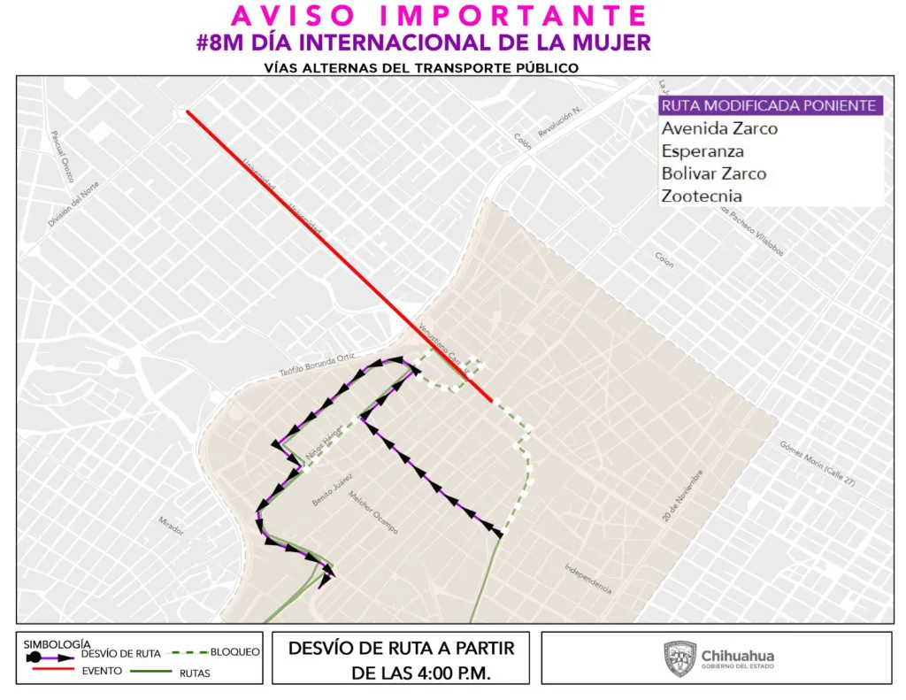 Las unidades que se ven alteradas al poniente son avenida Zarco, Esperanza, Martín López, Zootecnia y Bolívar Zarco; que circularán por Paseo Bolívar, baja por avenida Independencia para dar vuelta en Niños Héroes y bajar por calle Neri Santos, Julián Carrillo, avenida Ocampo y Niños Héroes.