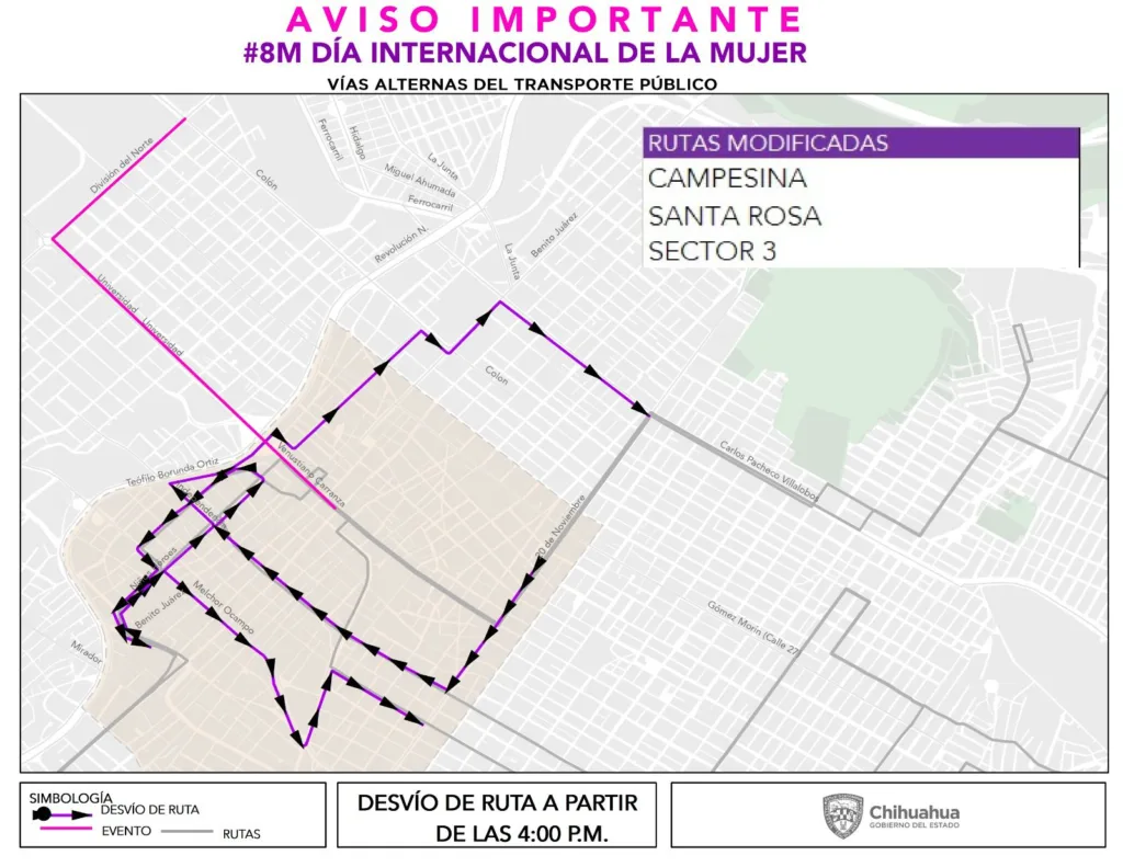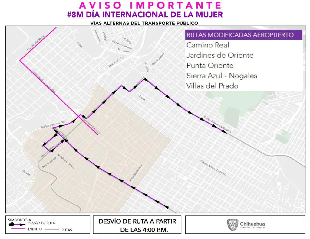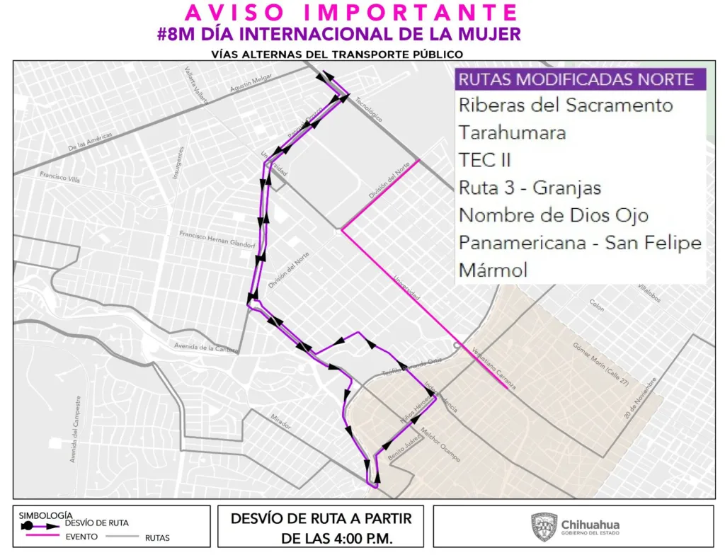 Las rutas modificadas al norte son: Riberas del Sacramento, Tarahumara, Tec II, Ruta 3-Granjas, Nombre de Dios Ojo, Panamericana-San Felipe y Mármol. El desvío de norte a sur es por avenida Tecnológico para dar vuelta por avenida Pascual Orozco para continuar por avenida San Felipe hasta la avenida campo y bajar por avenida Teófilo Borunda.