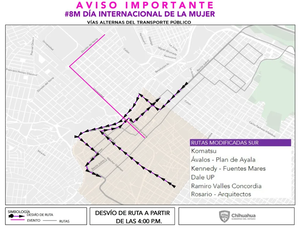 Mientras que para las rutas con cambio a la zona sur son: Komatsu, Ávalos-Plan de Ayala, Kennedy-Fuentes Mares, Dale UP, Ramiro Valles- Concordia y Rosario- Arquitectos con modificación de zona sur al centro, recorrido por avenida Independencia, avenida Teófilo Borunda hasta calle 13 para dar vuelta en avenida Niños Héroes y seguir su ruta habitual, con retorno por avenida Juárez, calle 27 hasta la avenida Teófilo Borunda hasta avenida Ocampo para dar vuelta en avenida Niños Héroes y continuar su ruta normal.