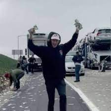 En las imágenes difundidas en redes, se puede apreciar el momento de la persecución de los autos, posteriormente, uno de los pasajeros al interior del vehículo arrojó el dinero que se esparció por la carretera.
