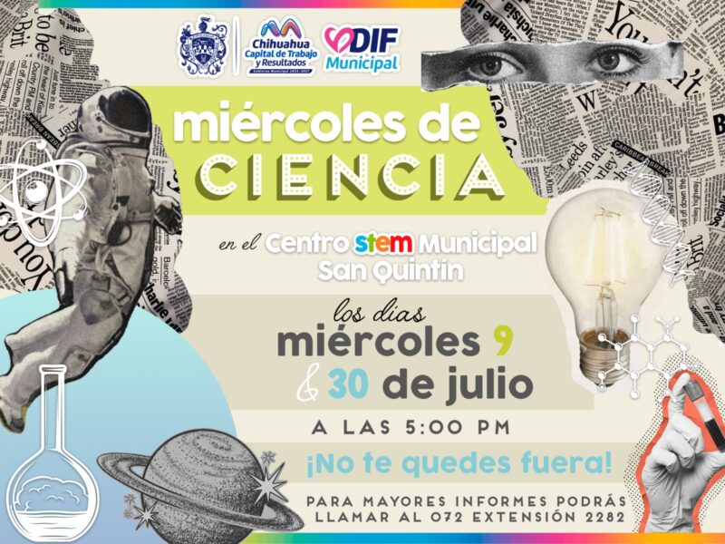 H. Ciudad de Chihuahua, Chih. A 08 de julio de 2025.- El Gobierno Municipal de Chihuahua, a través del DIF, invita a las niñas, niños, adolescentes y jóvenes, así como a sus familias a participar en los “Miércoles de Ciencia», en el Centro STEM Municipal San Quintín.