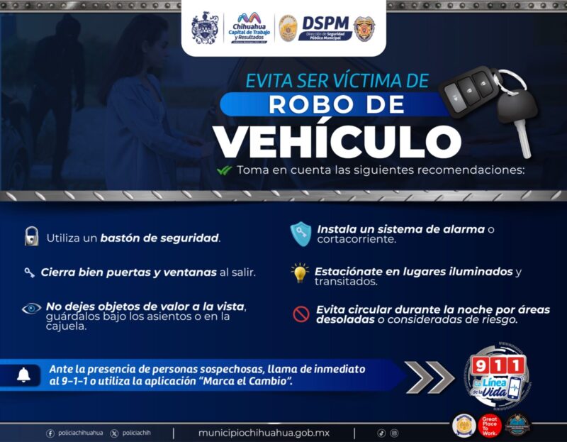 H. Ciudad de Chihuahua, Chih., a 22 de agosto de 2025.- Con la finalidad de proteger el patrimonio de las familias chihuahuenses, el Gobierno Municipal, a través de la Dirección de Seguridad Pública Municipal (DSPM), exhorta a reforzar las medidas de prevención y emite recomendaciones para evitar robos o daños en sus vehículos.
