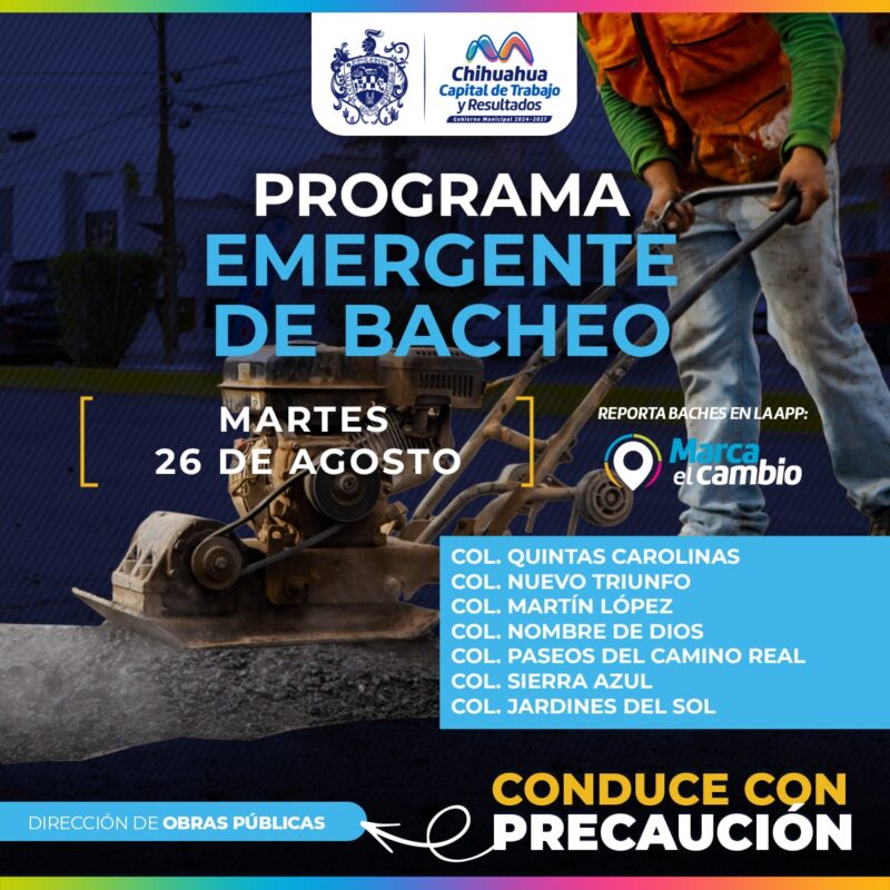 H. Ciudad de Chihuahua, Chih., a 26 de agosto del 2025.- El Gobierno Municipal, a través de la Dirección de Obras Públicas, intervendrá con bacheo este 26 de agosto, mediante el programa emergente, en las colonias Quintas Carolinas, Nuevo Triunfo, Martín López, Nombre de Dios, Paseos del Camino Real, Sierra Azul y Jardines Sol.