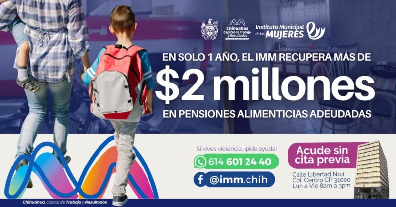 H. Ciudad de Chihuahua, Chih., a 07 de julio de 2025.- De julio de 2024 a julio de 2025, el Instituto Municipal de las Mujeres, logró recuperar 2 millones 162 mil 513 pesos de pensiones alimenticias adeudadas, resultado de 19 sentencias favorables a mujeres que acudieron en busca de acompañamiento y asesoría legal gratuita.