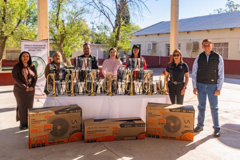 Entrega Estacionómetros Meoqui apoyo a Banda de Guerra y dos minisplit a Escuela 5 de Febrero de Estación Consuelo