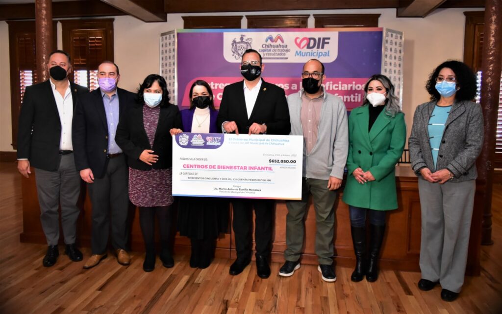 Preocupados por el bienestar de las familias chihuahuenses, Marco Bonilla, alcalde de Chihuahua, hizo entrega de un cheque por la cantidad de 652 mil 50 pesos, para que tres Centros de Bienestar Infantil, sigan atendiendo a niñas, niños y adolescentes que por alguna razón sus padres no pueden brindarles atención y alimentación básica.
