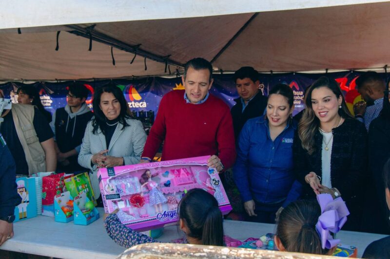 Chihuahua, Chih. A 6 de enero de 2025.- El alcalde Marco Bonilla, el director de TV Azteca Chihuahua Edgar Daniel Ruiz y el secretario de Desarrollo Humano y Bien Común Rafael Loera, hicieron entrega de los juguetes recabados durante el «Juguetón» qué cada año es organizado para llevar sonrisas.
