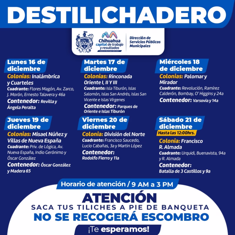 Chihuahua, Chih., a 13 de diciembre de 2024.- Para evitar acumulaciones de basura de grandes dimensiones en las viviendas, que podría generar plagas o problemas de salud, el Gobierno Municipal, a través de la Dirección de Servicios Públicos Municipales, informa el calendario del programa Destilichadero, que se realizará del 16 al 21 de diciembre en 11 colonias de la Capital.