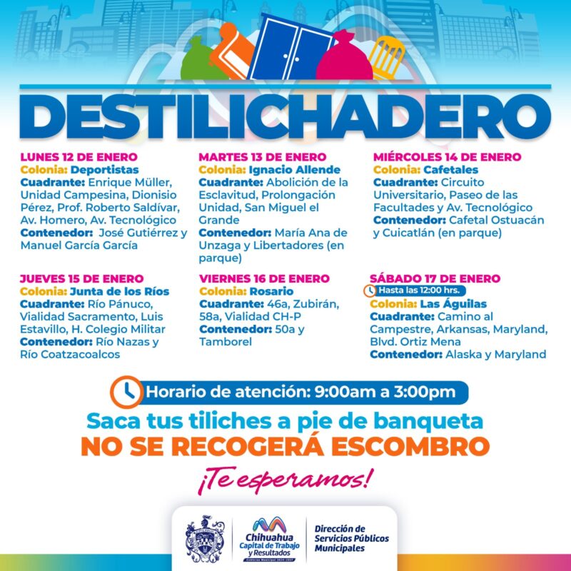 H. Ciudad de Chihuahua, Chih., a 10 de enero de 2026.- Para evitar acumulaciones de basura de grandes dimensiones en las viviendas, que podría generar plagas o problemas de salud, el Gobierno Municipal, a través de la Dirección de Servicios Públicos Municipales, informa el calendario del programa Destilichadero, que se realizará en 6 colonias de la capital del 12 al 17 de enero.