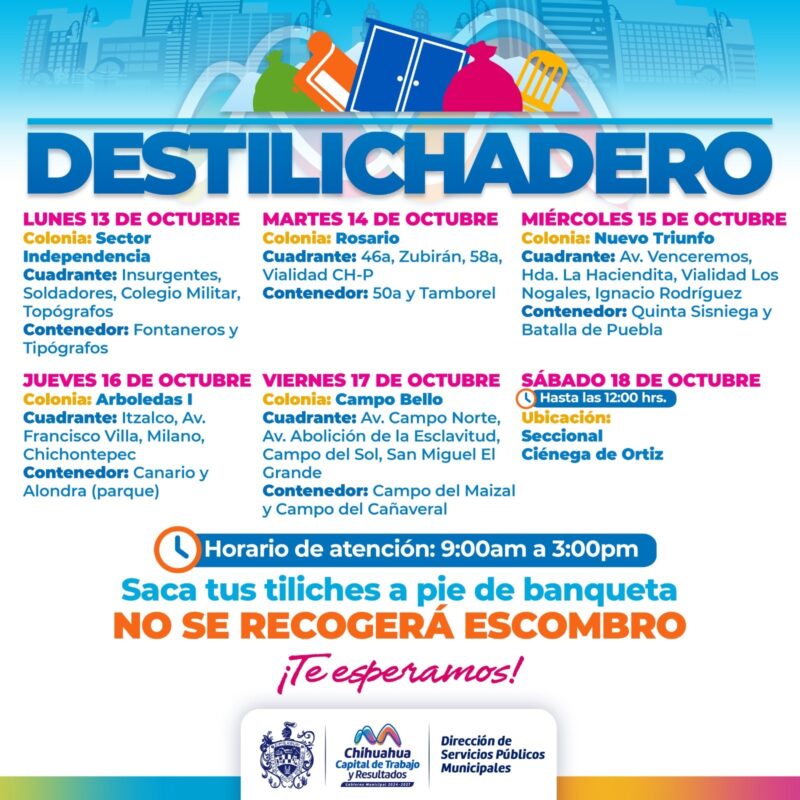 H. Ciudad de Chihuahua, Chih. A 11 de octubre de 2025.- Para evitar acumulaciones de basura de grandes dimensiones en las viviendas, que podría generar plagas o problemas de salud, el Gobierno Municipal, a través de la Dirección de Servicios Públicos Municipales, informa el calendario del programa Destilichadero, que se realizará 13 al 18 de octubre en seis colonias de la Capital.
