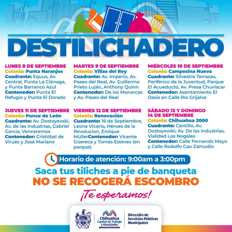 H. Ciudad de Chihuahua, Chih. A 6 de septiembre de 2025.- Para evitar acumulaciones de basura de grandes dimensiones en las viviendas, que podrían generar plagas o problemas de salud, el Gobierno Municipal, a través de la Dirección de Servicios Públicos Municipales, informa el calendario del programa Destilichadero, que se realizará 8 al 14 de septiembre en seis colonias de la Capital.