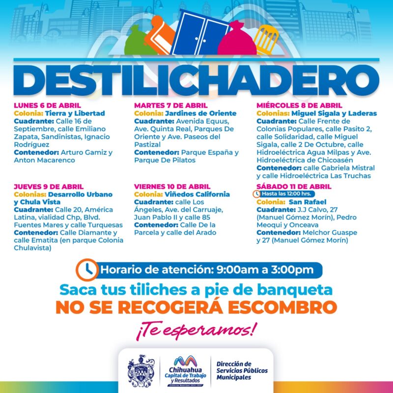 H. Ciudad de Chihuahua, Chih., a 4 de abril de 2026.- Para evitar acumulaciones de basura de grandes dimensiones en las viviendas, que podría generar plagas o problemas de salud, el Gobierno Municipal, a través de la Dirección de Servicios Públicos Municipales, informa el calendario del programa Destilichadero, que se realizará en ocho colonias de la capital del 6 al 11 de abril.