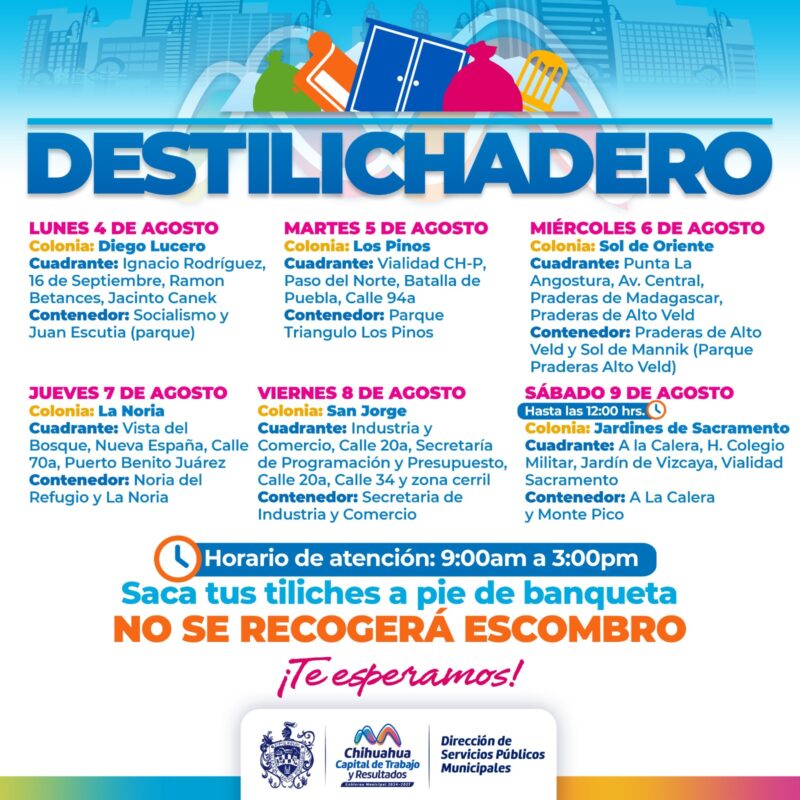 H. Ciudad de Chihuahua, Chih., a 2 de agosto de 2025.- Para evitar acumulaciones de basura de grandes dimensiones en las viviendas, que podría generar plagas o problemas de salud, el Gobierno Municipal, a través de la Dirección de Servicios Públicos Municipales, informa el calendario del programa Destilichadero, que se realizará del 4 al 8 de agosto en seis colonias de la Capital.