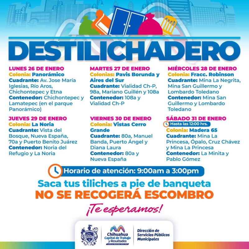 H. Ciudad de Chihuahua, Chih., a 24 de enero de 2026.- Para evitar acumulaciones de basura de grandes dimensiones en las viviendas, que podría generar plagas o problemas de salud, el Gobierno Municipal, a través de la Dirección de Servicios Públicos Municipales, informa el calendario del programa Destilichadero, que se realizará en siete colonias de la capital del 26 al 31 de enero.