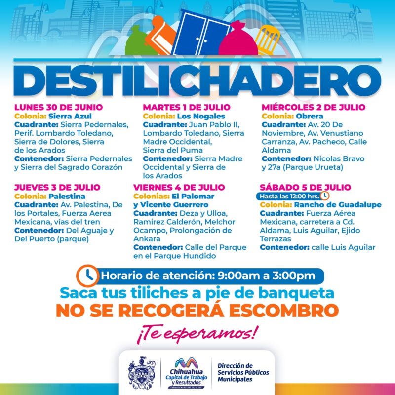H. Ciudad de Chihuahua, Chih. A 28 de junio de 2025.- Para evitar acumulaciones de basura de grandes dimensiones en las viviendas, que podría generar plagas o problemas de salud, el Gobierno Municipal a través de la Dirección de Servicios Públicos Municipales, informa el calendario del programa Destilichadero, que se realizará del 30 de junio al 5 de julio en siete colonias de la Capital.