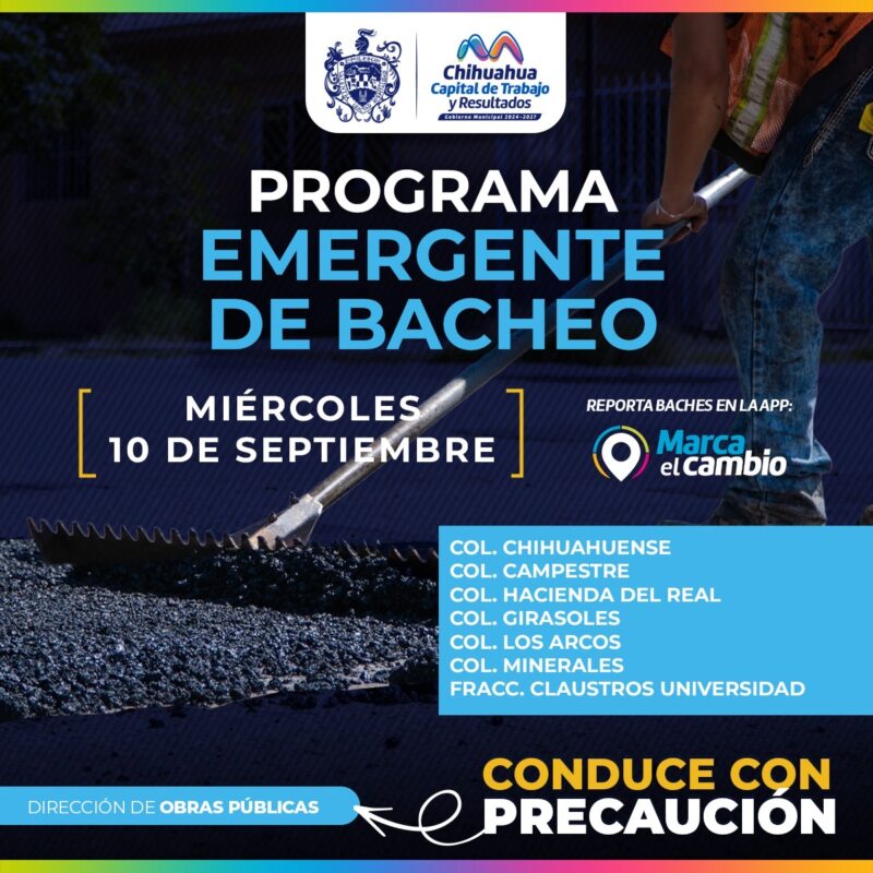 H. Ciudad de Chihuahua, Chih., a 10 de septiembre del 2025.- El Gobierno Municipal, a través de la Dirección de Obras Públicas, realizará trabajos de bacheo este 10 de septiembre, mediante el programa emergente, en las colonias Chihuahuense, Campestre, Hacienda del Real, Girasoles, Los Arcos, Minerales y en el Fraccionamiento Claustros Universidad.