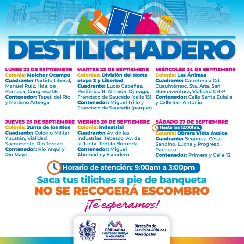 H. Ciudad de Chihuahua, Chih. A 20 de septiembre de2025.- Para evitar acumulaciones de basura de grandes dimensiones en las viviendas, que podrían generar plagas o problemas de salud, el Gobierno Municipal, a través de la Dirección de Servicios Públicos Municipales, informa el calendario del programa Destilichadero, que se realizará 22 al 27 de septiembre en siete colonias de la Capital.