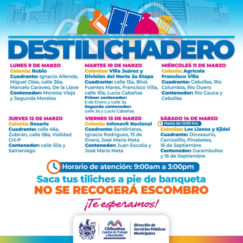 H. Ciudad de Chihuahua, Chih., a 7 de marzo de 2026.- Para evitar acumulaciones de basura de grandes dimensiones en las viviendas, que podría generar plagas o problemas de salud, el Gobierno Municipal, a través de la Dirección de Servicios Públicos Municipales, informa el calendario del programa Destilichadero, que se realizará en ocho colonias de la capital del 9 al 14 de marzo.