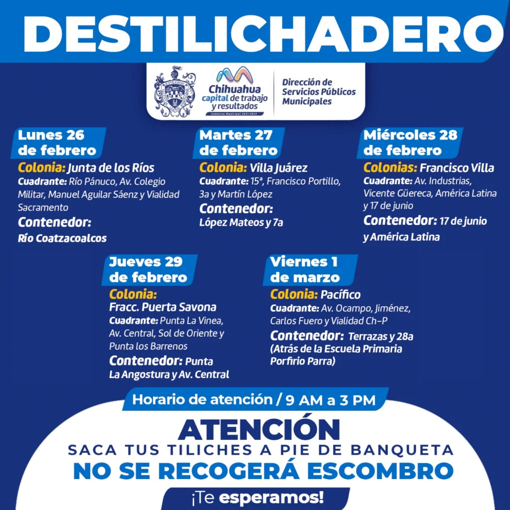 Chihuahua, Chih.- El Gobierno Municipal, a través de la Dirección de Servicios Públicos Municipales, informa el calendario del programa Destilichadero que se realizará del 26 de febrero al 1 de marzo en cinco colonias de la Capital.