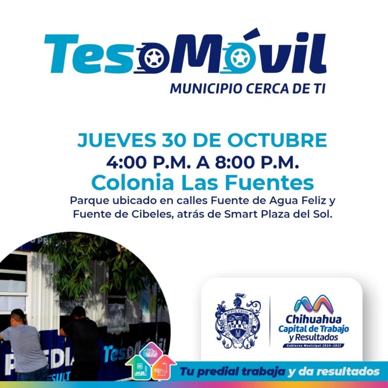 H. Ciudad de Chihuahua, Chih. A 14 de octubre de 2025.- El Gobierno Municipal, a través de la Tesorería, informa a la ciudadanía que el Teso Móvil visitará las colonias Haciendas del Valle II etapa y Las Fuentes en el mes de octubre.