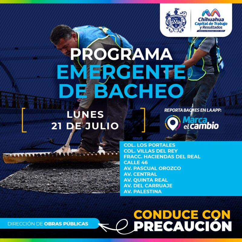 H. Ciudad de Chihuahua, Chih., a 21 de julio del 2025.-_ El Gobierno Municipal, a través de la Dirección de Obras Públicas, trabajará con bacheo este 21 de julio mediante el programa emergente en las colonias Los Portales, Villas del Rey, fraccionamiento Haciendas del Real, así como en la calle 46 y en las avenidas, Pascual Orozco, Central, Quinta Real, Del Carruaje y Palestina, este lunes.