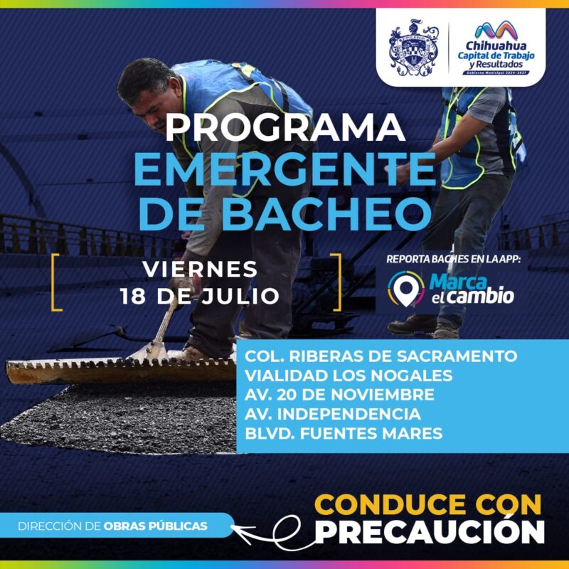 H. Ciudad de Chihuahua, Chih., a 18 de julio del 2025.- El Gobierno Municipal, a través de la Dirección de Obras Públicas, realizará trabajos de bacheo mediante el programa emergente en la colonia Riberas de Sacramento, la vialidad Los Nogales, en las avenidas 20 de Noviembre e Independencia, así como en el boulevard Fuentes Mares.
