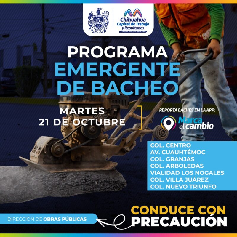 H. Ciudad de Chihuahua, Chih., a 21 de octubre del 2025.- El Gobierno Municipal, a través de la Dirección de Obras Públicas, bacheará este 21 de octubre, mediante el programa emergente, en calles de las colonias Centro, Granjas, Arboledas, Villa Juárez, Nuevo Triunfo, la avenida Cuauhtémoc y Vialidad Los Nogales.
