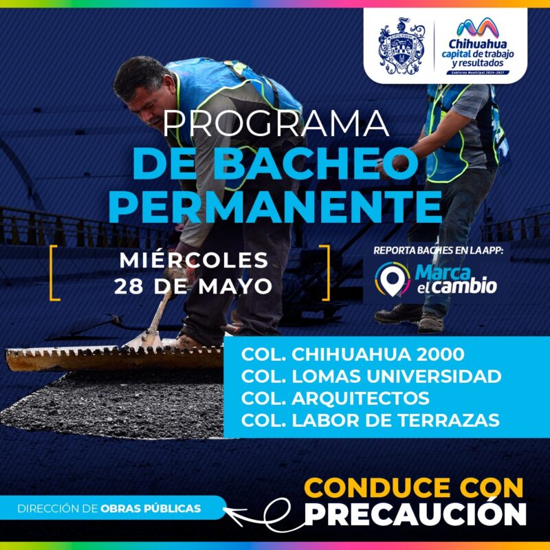 H. Ciudad de Chihuahua, Chih., a 28 de mayo del 2025.- El Gobierno Municipal, por medio de la Dirección de Obras Públicas, informa que este miércoles se tendrán labores de bacheo en las colonias Chihuahua 2000, Lomas Universidad, Arquitectos y Labor de Terrazas.