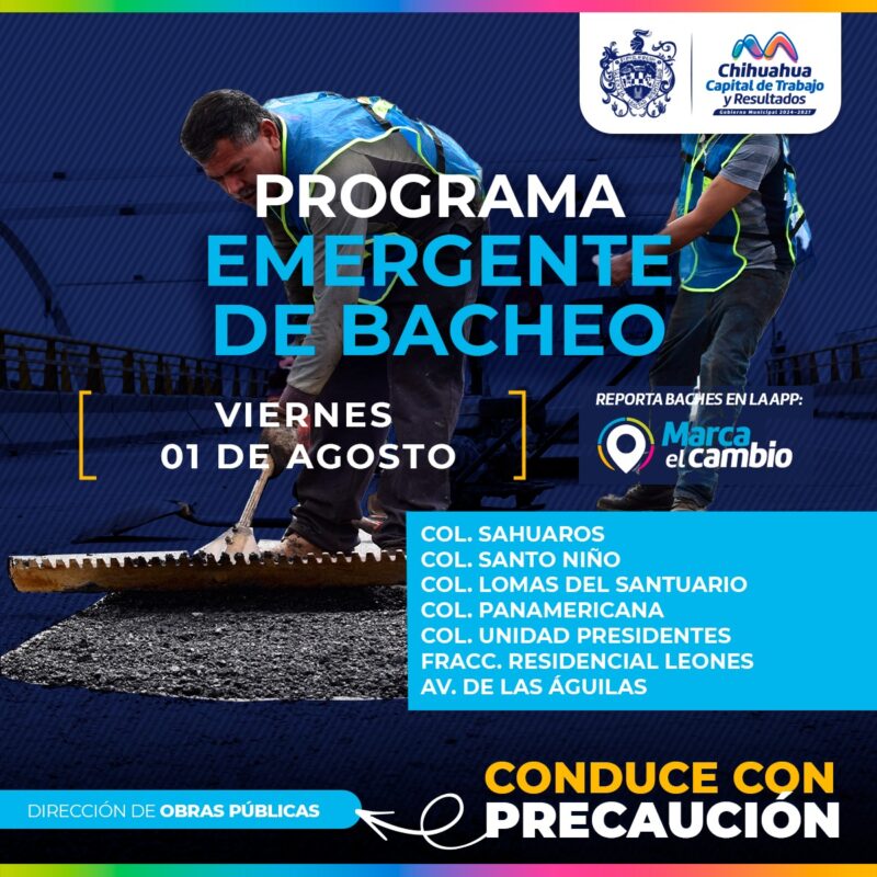 H. Ciudad de Chihuahua, Chih., a 1 de agosto del 2025.- El Gobierno Municipal, a través de la Dirección de Obras Públicas, trabajará con bacheo este 1 de agosto, mediante el programa emergente, en las colonias: Sahuaros, Santo Niño, Lomas del Santuario, Panamericana, Unidad Presidentes y en el Fraccionamiento Residencial Leones, así como en la avenida de las Águilas.