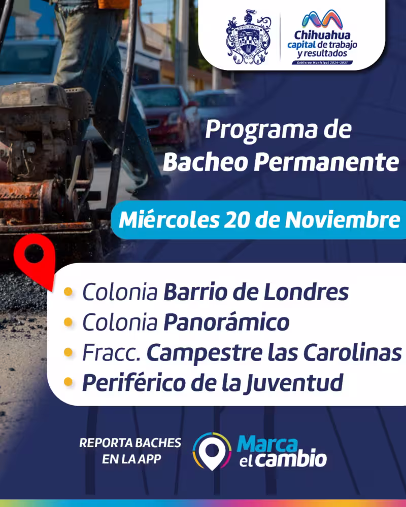 Chihuahua, Chih., a 20 de noviembre de 2024.- El Gobierno Municipal, a través de la Dirección de Obras Públicas, trabajará con bacheo este de 20 de noviembre en Periférico de la Juventud, Fraccionamiento Campestre las Carolinas y en las colonias Barrio de Londres y Panorámico.