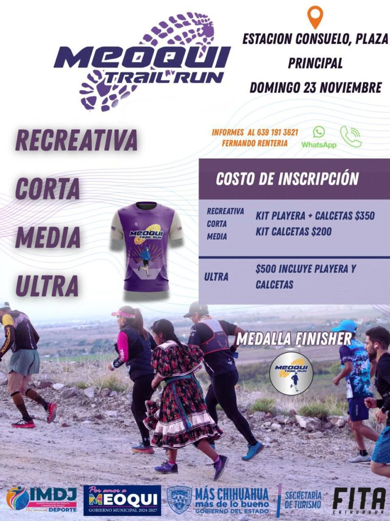 Meoqui ya se encuentra listo para la próxima edición del Meoqui Trail Run próxima a celebrarse este 23 de noviembre a partir de las 9 de la mañana, teniendo como punto de inicio la Plaza Principal de Estación Consuelo, recorriendo la sierra de la misma comunidad con rutas recreativas, cortas, medias y ultra, donde los participantes podrán disfrutar de los paisajes naturales que ofrece este lugar.