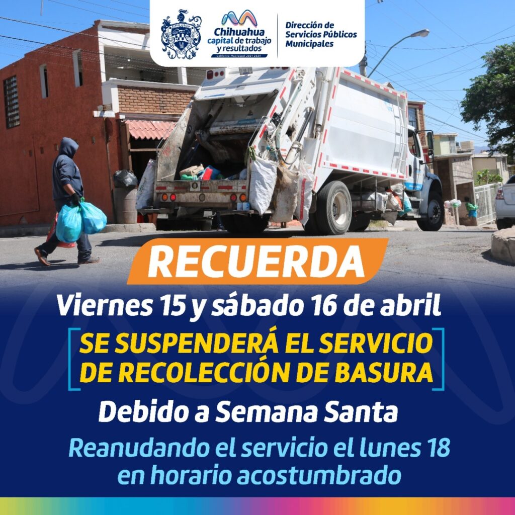 El Gobierno Municipal, a través de la Dirección de Servicios Públicos Municipales, recuerda a la población que este viernes 15 y sábado 16 de abril se suspenderá el servicio de recolección de basura habitacional, por lo cual se exhorta a la ciudadanía a tomar las precauciones debidas.