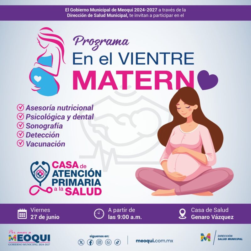 Este viernes 27 de junio, se llevará a cabo una jornada del programa “En el Vientre Materno” a partir de las 9 de la mañana en la Casa de Atención Primaria a la Salud de la Col. Genaro Vázquez del municipio de Meoqui, en la que se brindarán servicios como ultrasonido, asesorías psicológicas, nutricionales, vacunación, detección y estimulación prenatal de forma gratuita.