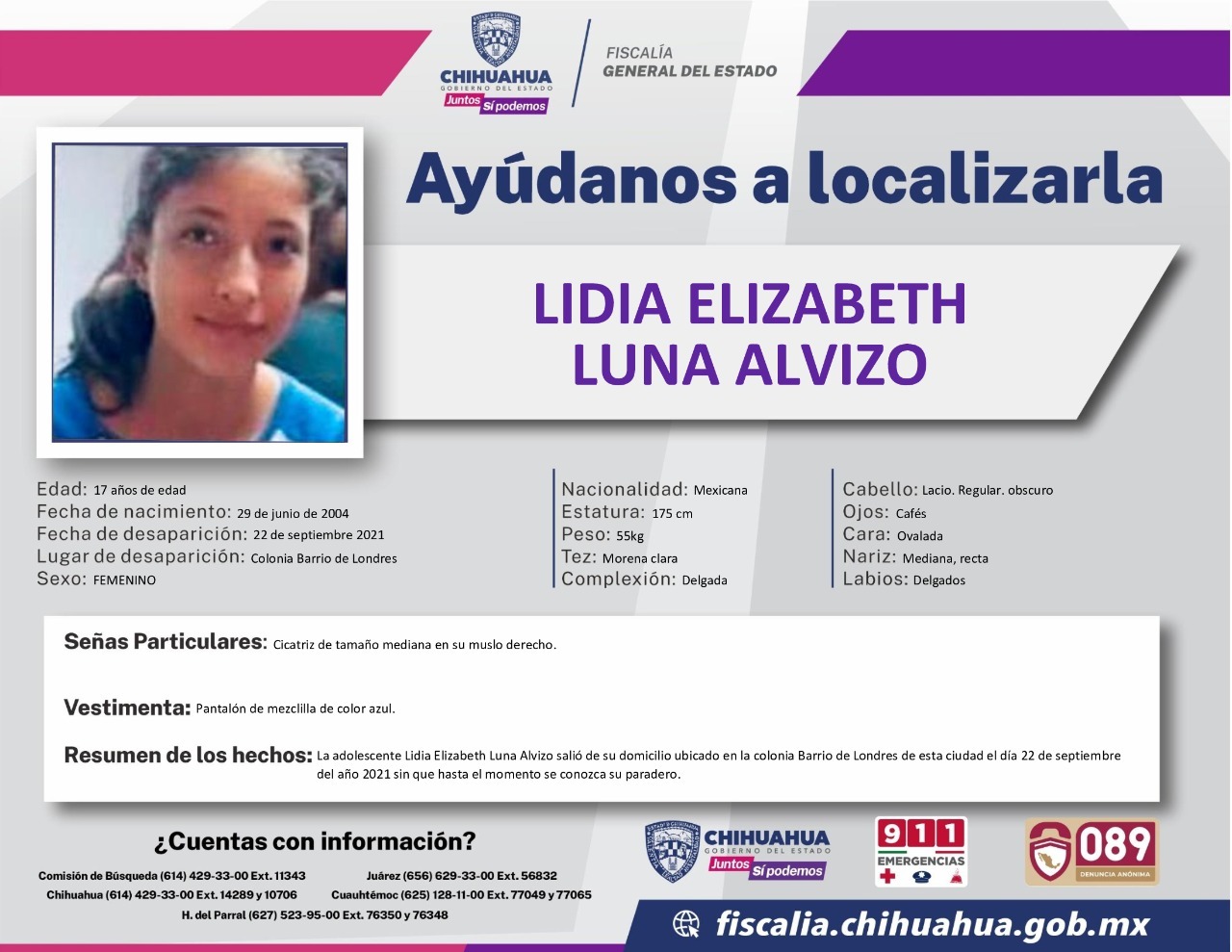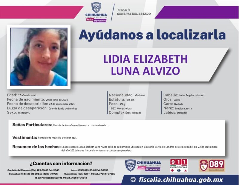 La Fiscalía General del Estado, informa que ya están en búsqueda de la adolescente Lidia Elizabeth Luna Alvizo, de 17 años de edad, para dar con su paradero.